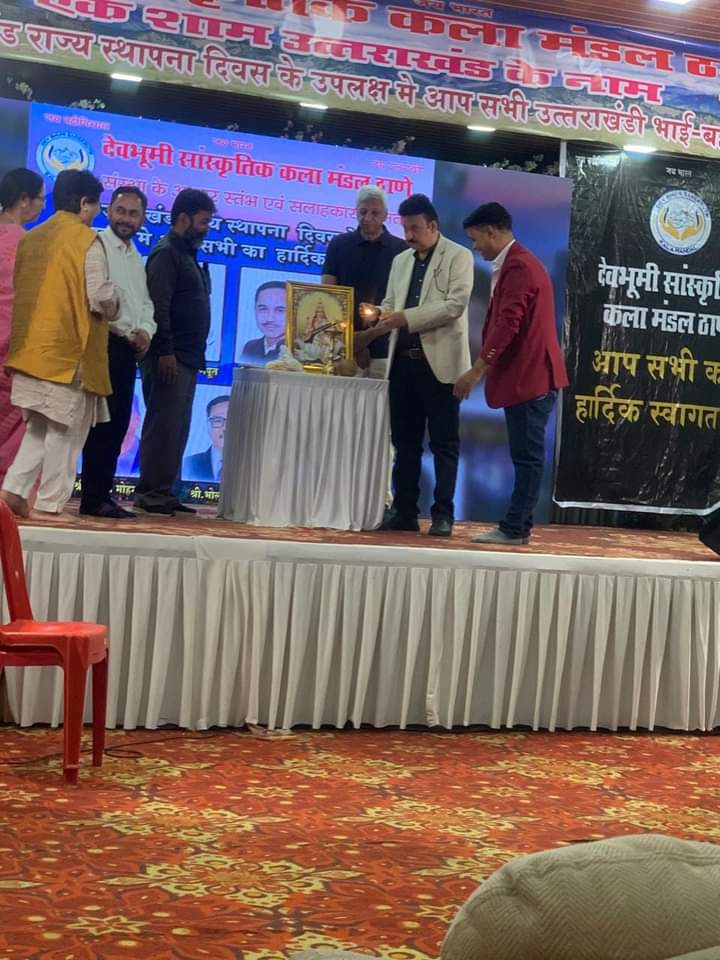 ठाणे के उत्तराखंड समाज के लोगों की जागरुक संस्था देवभूमि सांस्कृतिक कला मंडल ठाणे ने हर वर्ष की भांति इस बार रंगारंग सांस्कृतिक कार्यक्रम का आयोजन इस बार भव्य मैदान में न कर बैंक्वेट हॉल में किया क्योंकि महाराष्ट्र विधानसभा चुनाव को मध्य नजर रखते हुए यह करना पड़ा है। सांस्कृतिक संध्या का विधिवत सरस्वती पूजन – दीप प्रज्ज्वलित करते हुए उत्तराखंड समाज के वरिष्ठ समाजसेवी और ठाणे मनपा में तीन बार नगरसेवक रहे महदीप सिंह बिष्ट, समाजसेवी हयात सिंह राजपूत, प्रदीप रावत, अर्जुन इगराल, समाजसेवी प्रवीन ठाकुर, शिवसेना उत्तराखंड प्रकोष्ठ के वरिष्ठ नेता महावीर पैन्यूली, समाजसेवी ललित मोहन जोशी, मोहन खाती और संस्था के प्रमुख अशोक मुरारी, प्रदीप रावत श्रीमती तुली समाजसेवी सुदर्शना कपिल, वरिष्ठ पत्रकार केसर सिंह बिष्ट प्रमुख थे