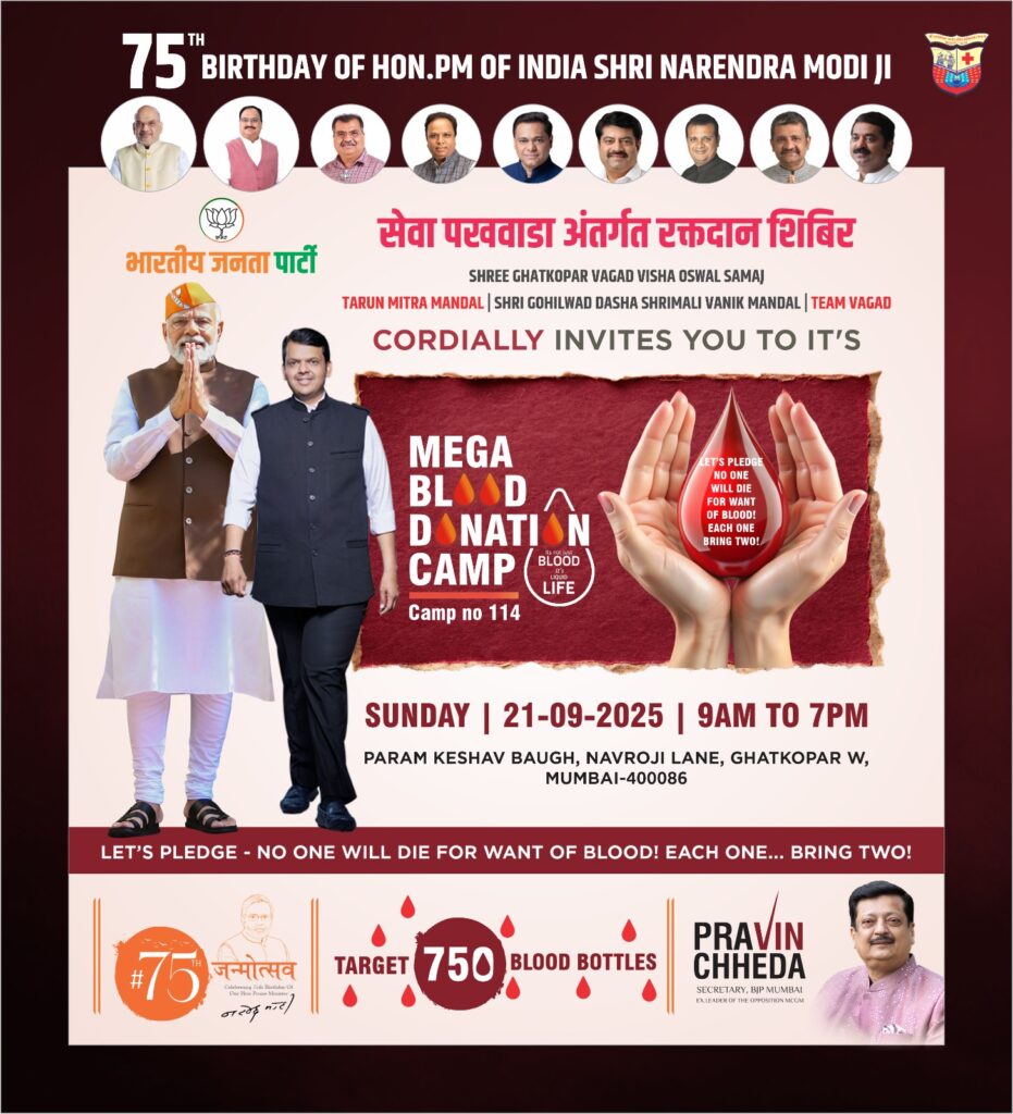 देशभर में प्रधानमंत्री नरेंद्र मोदी जी के 75वें जन्मदिवस के उपलक्ष्य में 17 सितंबर 2025 से 2 अक्टूबर 2025 तक सेवा पखवाड़ा मनाया जा रहा है। इस पखवाड़े के दौरान विभिन्न समाजोपयोगी कार्यक्रम आयोजित किए जा रहे हैं, इसी के तहत जहां मुंबई उपनगर घाटकोपर के भाजपा विधायक पराग शाह के सहयोग और समर्थन में जैन मुनि नम्रमुनि महाराज की ओर से कई समाजोपयोगी कार्यक्रमों का आयोजन किया गया।