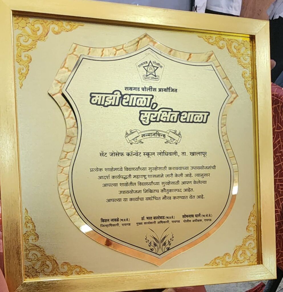 सेफ स्कूल अवार्ड से सम्मानित हुई सेंट जोसेफ कॉन्वेंट स्कूल