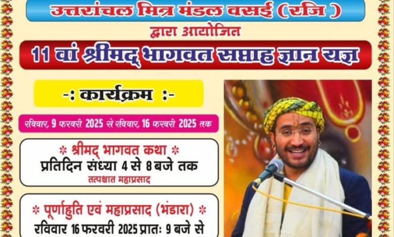 उत्तरांचल मित्र मंडल वसई*आयोजित श्रीमद्भागवत कथा ज्ञान यज्ञ रविवार ९फरवरी से